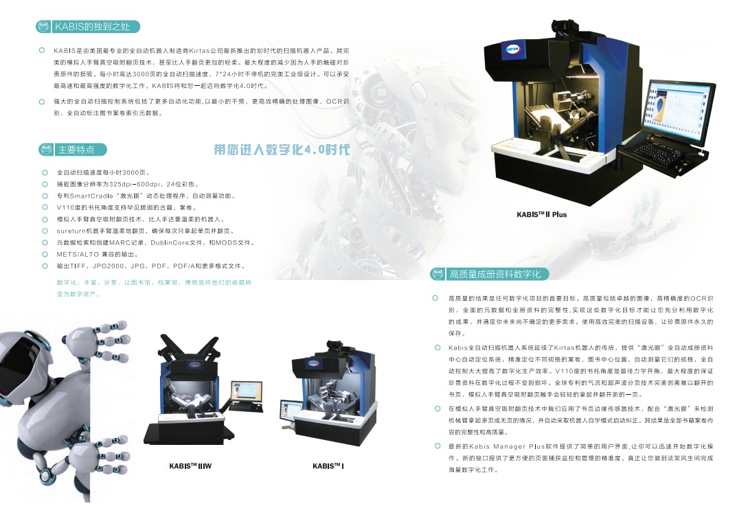 技術參數(shù):3300頁/小時,真空吸附式自動翻頁掃描機器人;掃描臺110度V型22.1兆相機X2