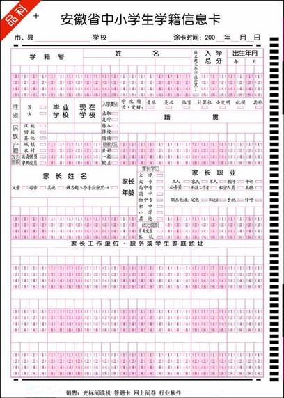 信息卡(又稱答題卡)是光標閱讀機輸入信息的載體,是配套光標閱讀機的各種信息錄入表格的總稱. 信息卡將用戶需要的信息轉化為可選擇的選項,供用戶涂寫.OMR設備根據信息點的涂與未涂和格式文件設置將信息還原.信息卡的式樣,是根據輸入計算機的信息并按照光標閱讀機的設計規范所要求的格式而設計的.為了實現數據的準確識別,信息卡要按一定的格式與方法進行設計,設計人員需經過培訓,才能設計出有效的信息卡.