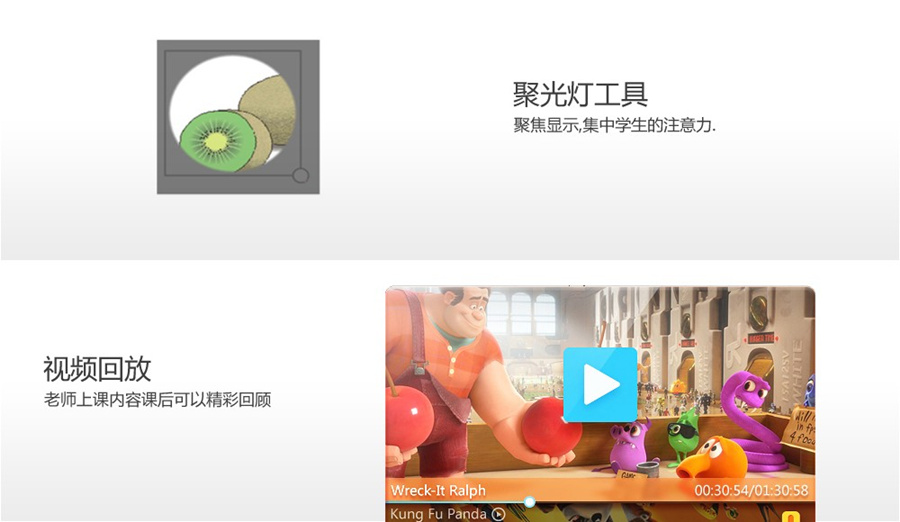 集成了電子白板、平板電視、電腦、投影機(jī)、投影幕布、音響、廣告機(jī)、WINI等多種功能為一體的互動教學(xué)機(jī),從而增強(qiáng)了教學(xué)互動性,使教學(xué)更簡潔、更簡易、更高效。
